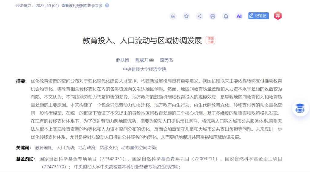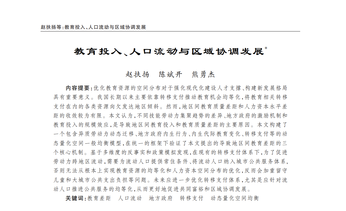 摘要:优化教育资源的空间分布对于强化现代化建设人才支撑、构建新发展格局具有重要意义。我国长期以来主要依靠转移支付推动教育机会均等化,将教育相关转移支付在内的各类资源向欠发达地区倾斜。然而,地区间教育质量差距和人力资本水平差距的收敛较为有限。本文认为,不同技能劳动力集聚趋势的差异、地方政府的激励机制和教育投入的规模效应,是导致地区间教育投入和教育质量差距的主要原因。本文构建了一个包含异质劳动力动态迁移、地方政府内生行为、内生代际教育变化、转移支付等的动态量化空间一般均衡模型,在统一的框架下验证了本文提出的导致地区间教育差距的三个核心机制。基于多维度的反事实和政策模拟发现,在现有的转移支付体系下,为了促进劳动力跨地区流动,需要为流动人口提供常住条件、将流动人口纳入城市公共服务体系,否则无法从根本上实现教育资源的均等化和人力资本空间分布的优化,反而会加重留守儿童和大城市公共支出负担等问题。未来应进一步优化转移支付体系,尤其是应针对流动人口推进公共服务的均等化,从而更好地促进共同富裕和区域协调发展。